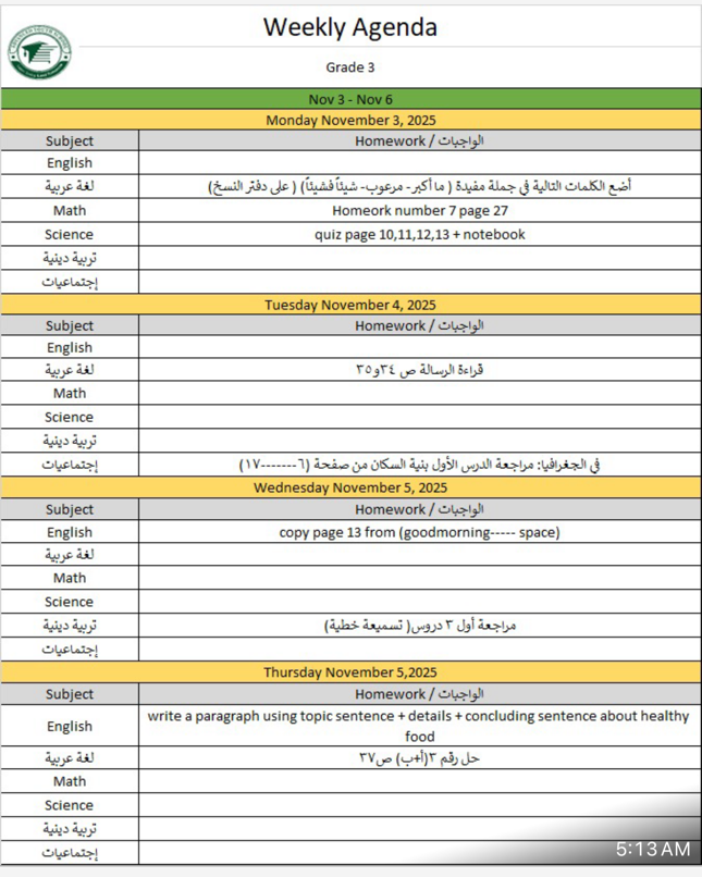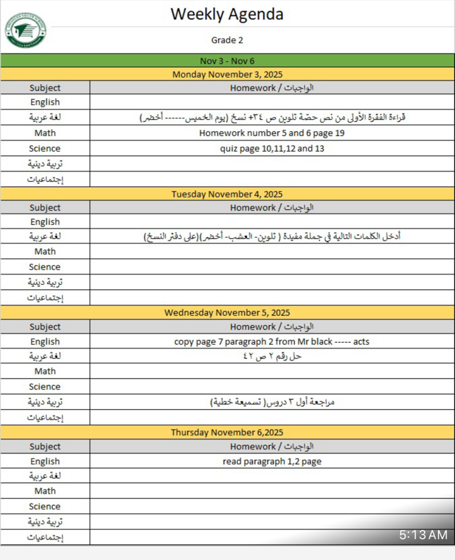 School Year 2025 - 2026 Weekly Activities November week 3 - 6 Grade 1 Grade 2 Grade 3 Grade 4 Grade 5
